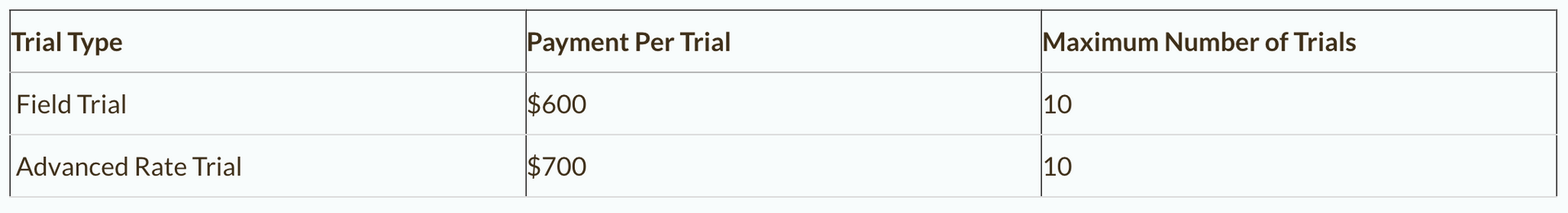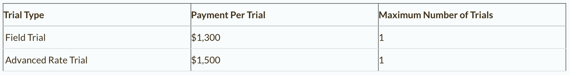 Farmers and crop advisers are compensated for each field trial. The rate of compensation is higher for those that participate in the Advanced Rate Trial. Due to State contracting policies, individual participant payments are paid in two equal installments (June & December).