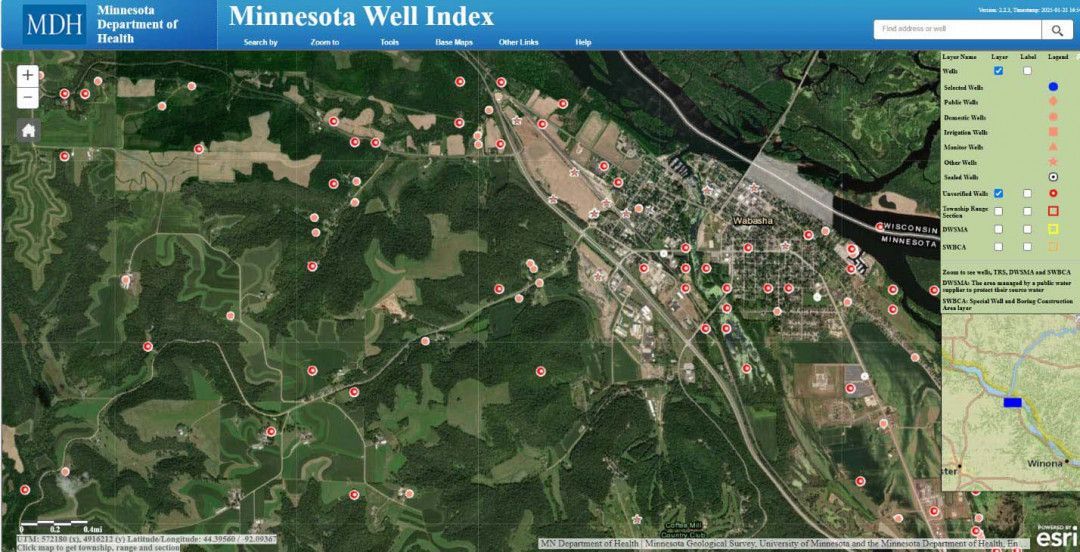 The Minnesota Department of Health maintains a map (MN Well Index) that provides basic information and locations for water supply wells. One of the main uses of the map is to identify water supplies that may be vulnerable to leaks and spills and to aid responders in emergency situations. A Post Bulletin article (see photo) captured the frustration a well owner can encounter when their water supply is left off the map. To make sure that everyone relying on a private well is considered, the Department of Health has asked us to assist them in updating the map for Wabasha County. To check to see if your well is already inventoried, visit the MN Well Index online map and type in your address. A dot near or at your well's location indicates that your well is already inventoried.